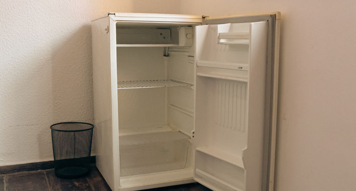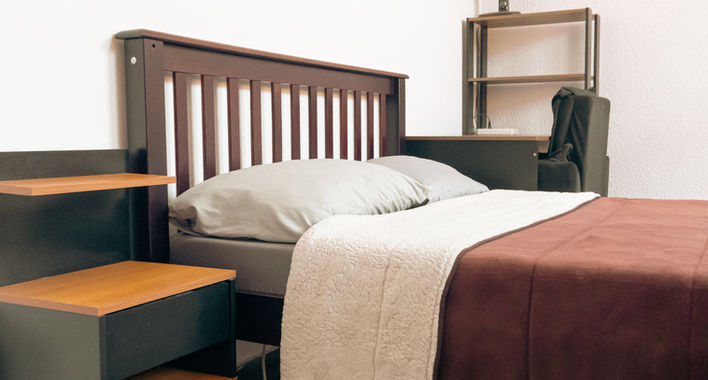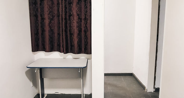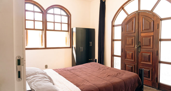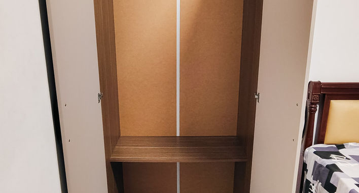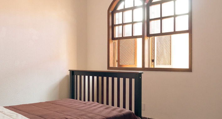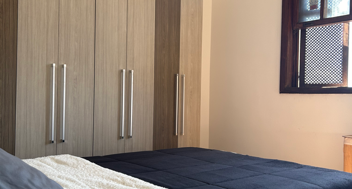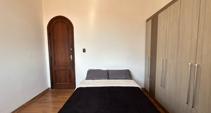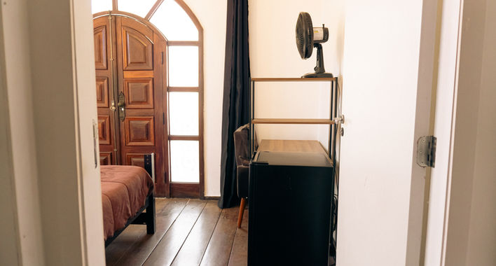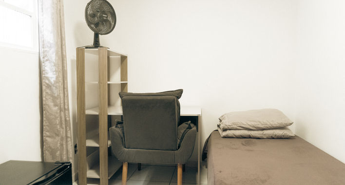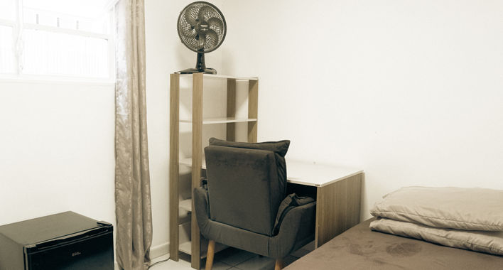 Mobília: cama de casal, mesa, poltrona, guarda-roupa, ventilador e frigobar.
